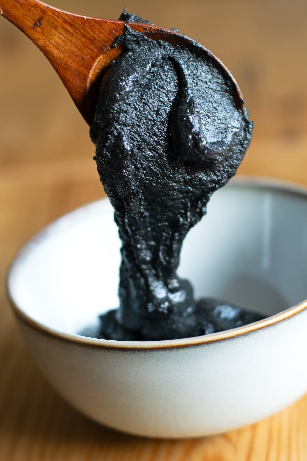 Black sesame paste, also called kurogoma or neri goma, is made by grinding roasted black sesame seeds into a thick, spreadable paste.